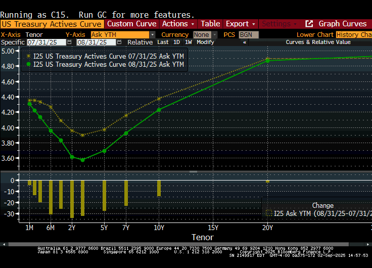 Bond traders will be taking their direction from the outcome of the September Fed meeting, and whether markets will get a series of rate cuts, or possibly just one. August employment will be a sensitive release given the large changes to prior months. Inflation data will continue to drive the shape of the yield curve. In addition, US politics has continued to serve as a catalyst for macro markets, whether it's Federal Reserve involvement, new tariff announcements, chip investments and company specific deals.