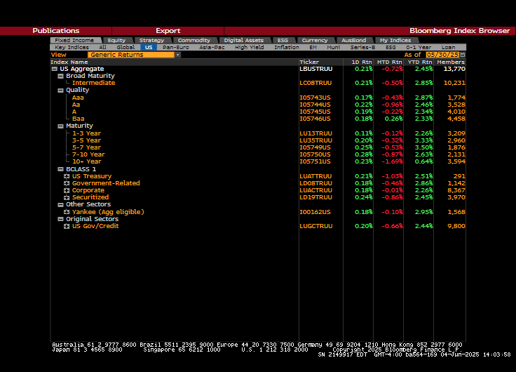 In other words, with the Fed on hold (even hinting at a hawkish bias) and heavy supply on the horizon, the path of least resistance for long-term yields was upward. For bond investors, rising rates translated into mixed performance across fixed income sectors. Treasury prices fell, delivering negative total returns for May – especially on the long end. A popular long-duration Treasury index (TLT) dropped about –3.2% in the month, exemplifying the rate sensitivity of extended maturities. Shorter-duration Treasuries held up better (the 2-year note’s price was nearly flat), but overall, the broad Bloomberg U.S. Aggregate bond index logged a .72% loss for May.