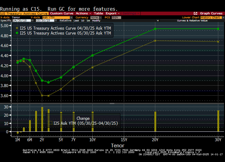 The fixed income arena experienced a negative turn in May, as improving economic optimism and renewed concerns about inflation pushed U.S. Treasury yields higher across the curve. After rallying in April, Treasuries sold off in May: the benchmark 10-year Treasury yield jumped roughly 24 basis points, ending the month around 4.4%. The 2-year Treasury yield also rose by approximately 0.30% to about 3.9%. (Notably, yields had swung lower in April amid the trade scare, so May’s backup in rates still left short-term yields below their March highs.) This rise in long-term yields outpaced the short end – for example, the 3-month T-bill nudged up only 5 bps – resulting in a steeper yield curve by month’s end. The steepening was driven in part by reduced expectations of immediate Fed rate cuts and by investor concerns about mounting federal deficits and Treasury issuance.